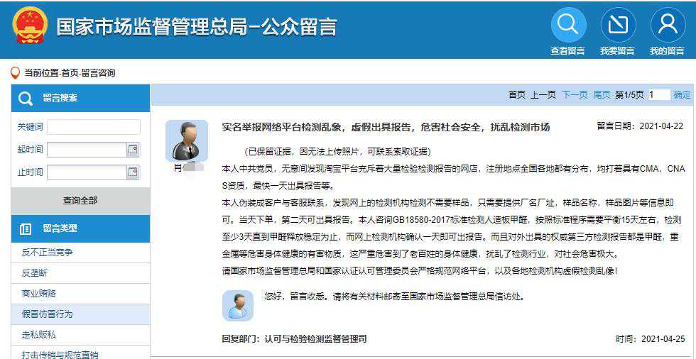前不久,有网友向国家市场监督管理总局反映,淘宝上充斥着大量出售检验检测报告的网店,不需要样品,当天下单,次日就可出具所谓第三方权威检测机构的报告。隐患多,危害大。