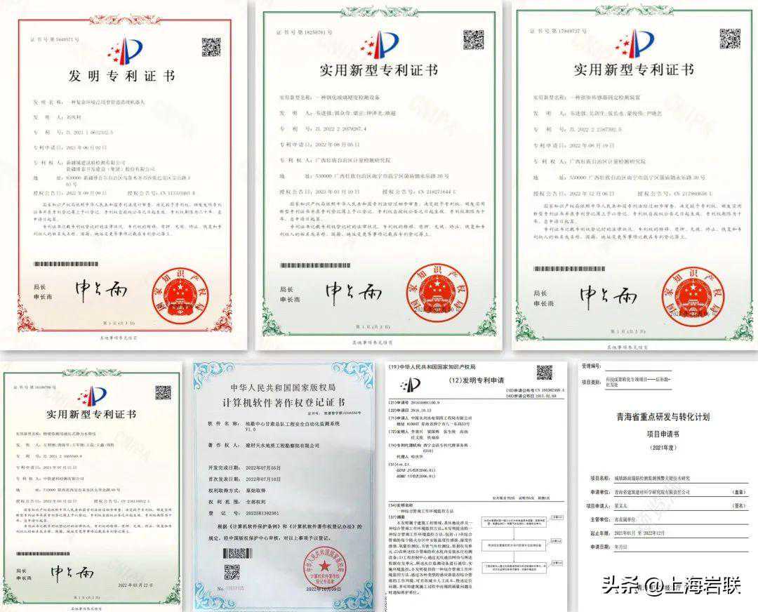 岩联技术一直在前行的路上。2017年以来,岩联技术与新疆城建试验检测有限公司联合发明《一种综合管廊工作环境监控方法》、《一种复杂环境泛用型管道清理机器人》;与建材天水地质工程勘察院有限公司联合研发《地勘中心甘肃总队工程安全自动化监测系统》等专利项目,纵深推进科技成果转化,真正实现“势能”成功转化为“动能”。