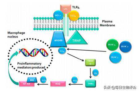 当细菌侵入人体后,会释放其表面LPS,LPS首先与脂多糖结合蛋白(lipopolysaccharide-bindingprotein,LBP)结合,LBP将LPS运送到免疫细胞的膜表面,与膜表面的蛋白质CD14相结合。随后CD14将LPS转运至Toll样受体4(Toll-likereceptor,TLR4)及髓样分化蛋白2(myeloiddifferentiationprotein-2,MD2)形成蛋白复合体。