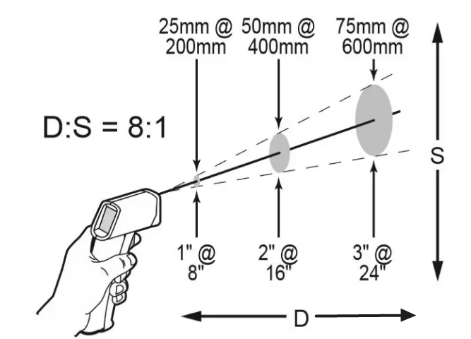 举例:机器的距离系数比为8:1。当被测目标直径为1cm时,则红外测温仪至被测目标的最远距离为8cm。如果在超过8cm的距离进行测试,则误差会超过机器的允许范围,导致测试结果无意义。