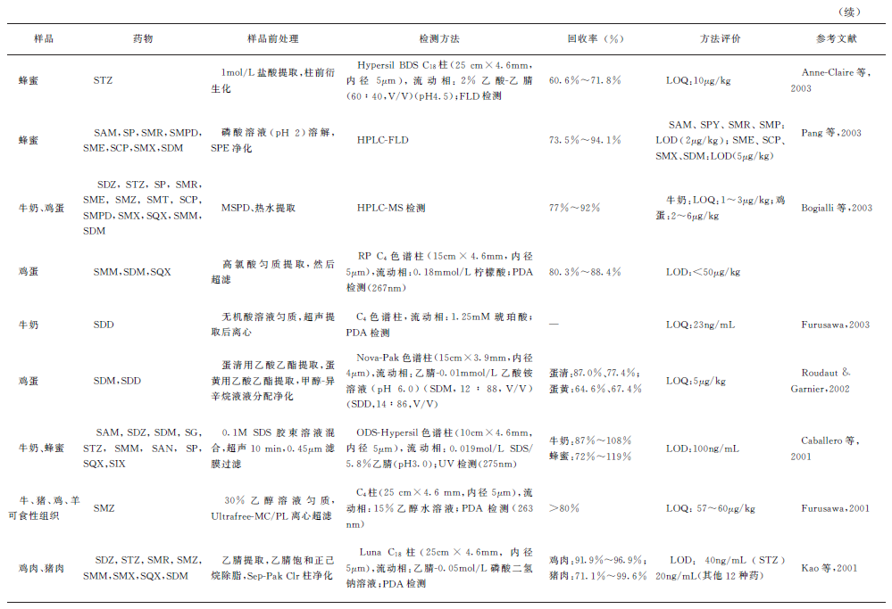 目前检测各种基质中SAs残留的方法包括高效液相色谱法(HPLC)、液相色谱-质谱法(LC-MS)、气相色谱-质谱法(GC-MS)、TLC、高效毛细管电泳(HPCE)、免疫学测定法等。