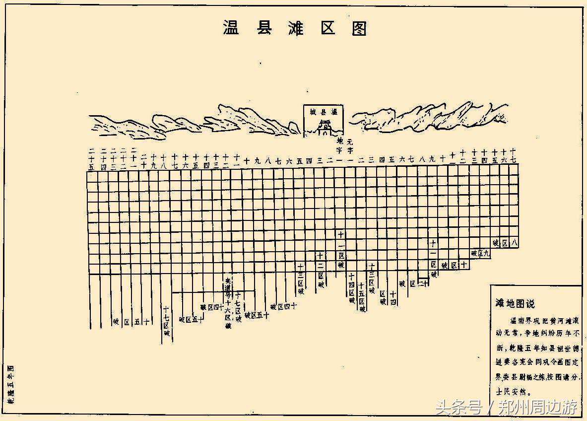 乾隆五年,经县令租世德同巩县令张雷光,依省宪审批,发落定案,丈界立桩。并绘制了温县滩地图。其图为:以县城东南角为基点编号,一里编一号,向东为4元字”号,共17号接武陟界;向西为“地”字号,共25号,接盂县界。南北宽亦从基点起向南,一里划为一区。东边,南至汜水界,编九至十二区不等;西边,南至巩县界,编十五区,全部温县滩区,约545平方里。
