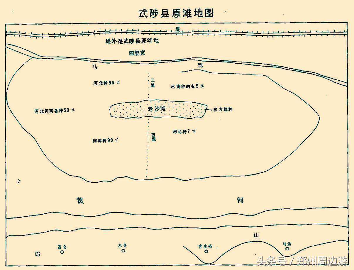 黄河北岸老滩、半老滩以南之小河沟南的新滩地,按南北平均分为十二份。靠东十二份之二归武陟,靠西的十二份之三归温县,其间十二份之七归成皋。