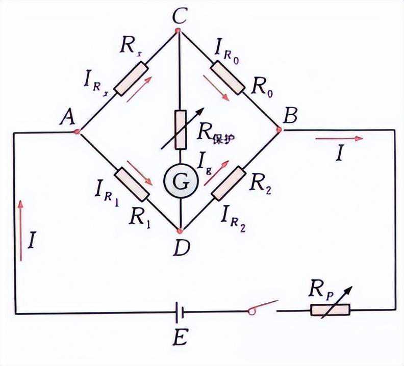 一个惠斯通电桥的原理图,四个电阻R、R0、R1、R2连成四边形,称为电桥的四个臂;四边形的一条对角线连有电流计,称为“桥”;四边形的另一对角线接上电源E,限流电阻Rp用于限制电流的大小,主要目的在于保护电流计和改变电桥灵敏度。