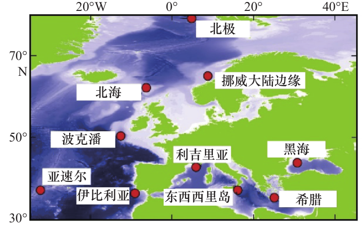 深海环境观测装置包括海底观测站、海底观测链、海底观测网络。海底观测站通过自容式储备电能方式,实现在海底固定位置的长期连续观测,简单易行,可大量地应用于海底观测。然而面对自带电能的限制和实时通信的难题,海底观测站必须依赖水下潜器之类的深海运载工具去补充能量、收取采集的信息。海底观测链解决了观测数据的通信问题,拓展了海底观测站的功能;将数个海底观测站“链”接起来,然后通过水声通信等方式将观测数据发送到海面,再经由卫星通信系统将信号发回岸基实验室供科学家们进行“准”实时研究。但是,传统的海底观测链仍然无法解决海底原位观测站的能量供给问题,水声通信方式存在数据带宽低、实时性差等问题。海底观测网络将功能齐全的观测平台放置到海底,联网设在海底的观测设备甚至埋藏在钻孔中的观测器,通过光纤电能网络向各个观测点输送电能并收集信息,可进行长期的自动化观测,相关建设更为各国所重视。1989年以来,英国国家海洋中心建设的豪猪深海平原可持续观测站(PAPSO)持续开展深海生物地球化学和生态学的时间序列研究[6]。美国1996年建设了深海长期生态系统观测系统LEO-15,华盛顿大学2010年在水合物脊建立了OOI-RSN,重点观测天然气水合物的环境生态效应和对地震的响应。加拿大维多利亚大学创建了“加拿大海洋网络”(ONC)非营利性组织,2006年在沿海海洋建造了世界首个有线海底观测站VENUS[7],2009年建造了世界首个区域性有线海洋观测网络NEPTUNE(见图5)[8]。欧洲多个机构自2008年开始建设长期的多学科海底观测站网络EMSO(见图6),在北冰洋到黑海的欧洲关键海域实时监测温度、pH、盐度、水循环、海床运动等参数,服务于地球物理、化学、生物、海洋学等多学科结合的长周期观测研究[9]。
