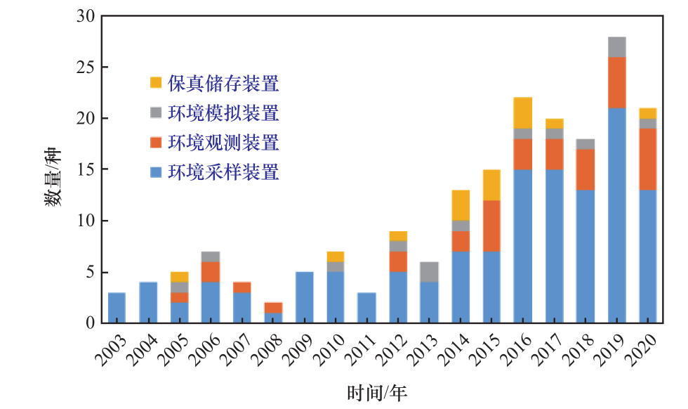 我国经历多年艰辛探索,直到2003年才研制了深海环境探测装置(见图9),相关技术又经过约10年的摸索才逐渐成熟;此后每年都出现一批自主研发的装置,装备发展水平逐渐实现从“跟跑”向“并跑”阶段跨越。