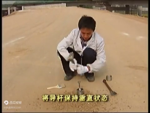 →4、将导杆保持垂直状态,用取土器落锤将环刀打入压实层中,至环盖顶面与定向筒上口齐平为止。
