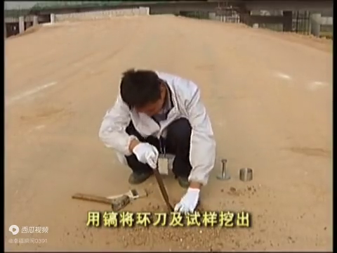 →5、去掉击实锤和定向筒,用镐将环刀及试样挖出。