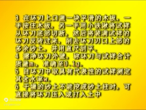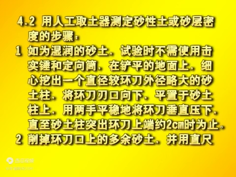→6、干燥的砂土不能挖成砂土柱时,可直接将环刀压入或打入土中。
