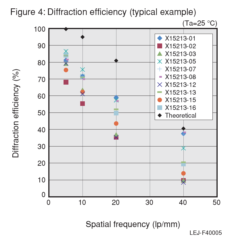 滨松可以提供355nm-1550nm范围内的OEM定制产品,我们可以为您专门优化您应用中需要用到的波长。具体需求请联系我们。另外,有些品牌将反射率称为"零级衍射效率",这其实是一回事,不要把"零级衍射效率/光利用率/反射率"与"一级衍射效率"混淆。