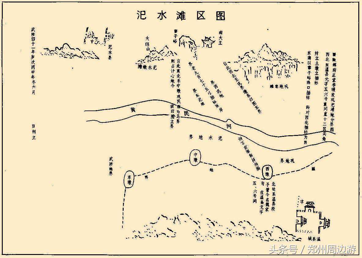 据民国十七年《县志》记载,“大田方歌于前,蟊贼遂乘其后,邻封愤嫉,豪强并吞。佃户潘印为温民郑之俊所杀,冯守业又为河阴张化龙所毙,人因地死,经界安正!汜民陈所闻等呈告九年,经三抚、三按、五司、七道、七府、九厅、一州、九县历断多案,至本府清军同知袁懋贞始得质……从此定封疆,正经界。汜水县滩地界:东至河阴县石槽沟为限,西至巩县英峪为限,东北以武陟县柳毅庙、南应敖仓石槽沟为限。河北徙则地南出,汜民管业耕种,河南徙则地北出,武民管业耕种。以河为界.从不争境,至于西北汜水县与温县地封界问题,则引组竖染筑塍为限,共丈东滩地一百八十顷,西滩地二百六十八顷二十四亩。东西编号为:原、隰,既、平、泉、流、清、夹、时、靡、有、争、王、心、宁。“时”、“清”中间有夹道区,即汜水人河之故道。宁四区有拐地一段,斜人温、巩交界处;宁六区有拐地一段,斜入巩境内。