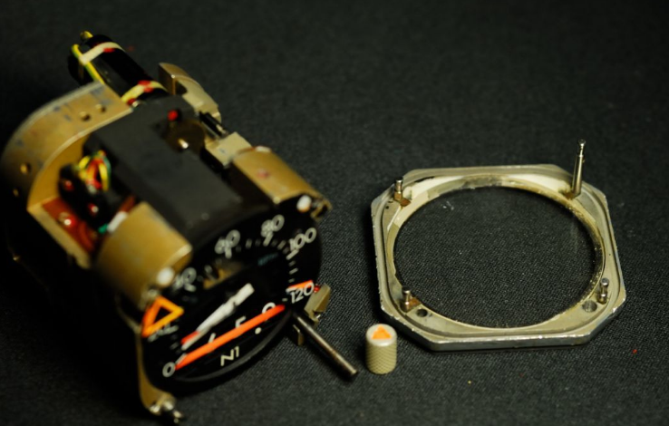 这个小部件在上电后会抬起数字指示前方的黄色标记,断电后自动落下,用于指示仪表运行状态,防止飞行员在仪表故障或断电情况下读出错误数值