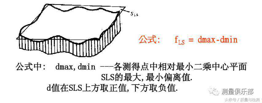 定义:此方法以最小二乘中心平面SLS作为评定基面,取各测得点相对于该评定基面的偏离值中的最大值和最小值之差作为平面度误差值Fls,见下图所示:
