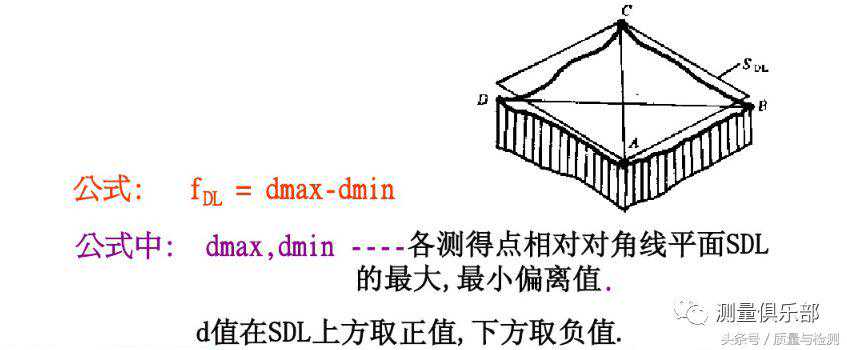 定义:此方法以对角线平面SDL作为评定基面求得各测得点相对于它的偏离值中的最大值和最小值之差作为平面度误差值Fdl,见下图所示: