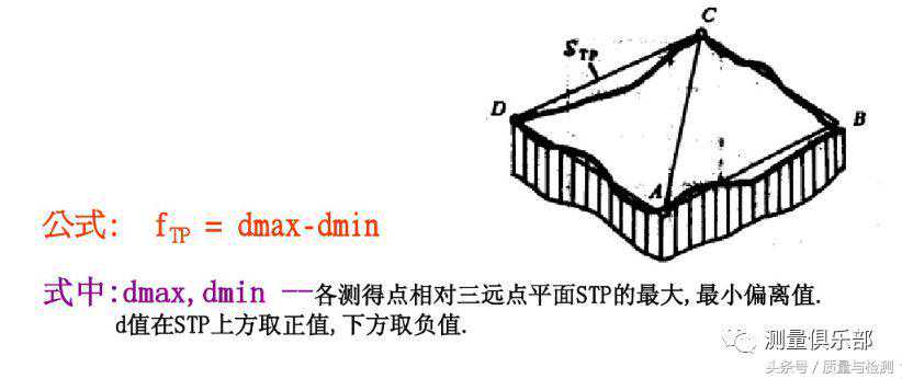 定义:此方法以三远点平面STP作为评定基面,求得各测得点相对于它的偏离值中的最大值和最小值之差作为平面度误差值Ftp,见下图所示: