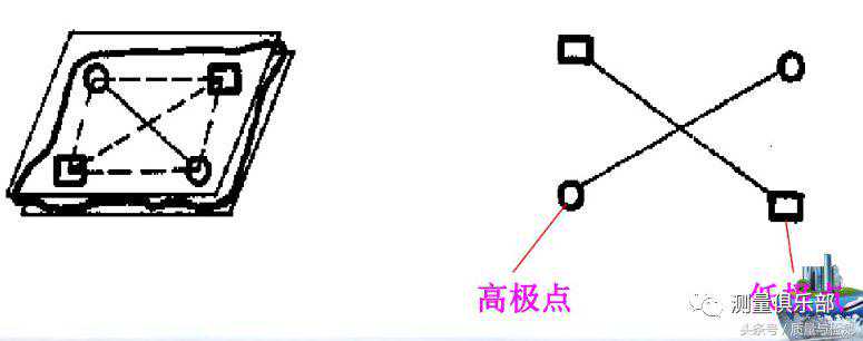 实际被测平面上有两点与两个平行包容平面之一相接触,还有两点与另一包容平面相接触,由前两点和后两点各自连接而成的两条直线在包容平面上的投影呈交叉状态,见下图所示: