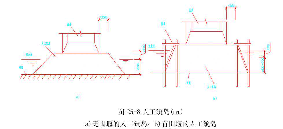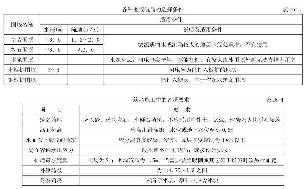 各种围堰的选择条件如表25-3,筑岛施工要求如表25-4。
