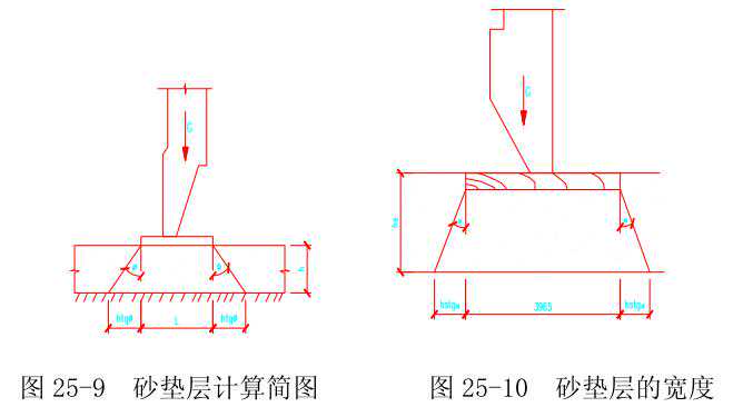 当地基强度较低、经计算垫木需用量较多,铺设过密时,应在垫木下设砂垫层加固,以减少垫木数量,如图25-9所示。砂垫层厚度应根据第一节沉井重量和垫层底部地基土的承载力进行计算,计算公式如下: