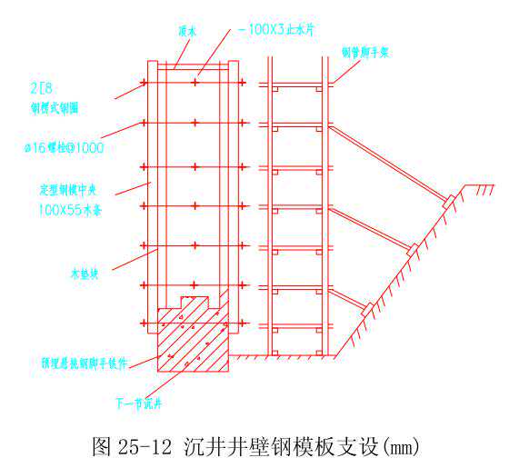 井壁模板采用钢组合式定型模板或木定型模板组装而成。采用木模时,外模朝混凝土的一面应刨光,内外模均采取竖向分节支设,每节高1.5~2.0m,用Φ(12~16)mm对拉螺栓拉槽钢圈固定,如图25-12所示。有抗渗要求的,在螺栓中间设止水板。第一节沉井筒壁应按设计尺寸周边加大10~15mm,第二节相应缩小一些,以减少下沉摩阻力。对高度大的大型沉井,亦可采用滑模方法制作。用滑动模板浇筑混凝土,可以不必搭设脚手架,也可以避免在高空进行模板的安装及拆除工作。滑模是在特殊装置下,以一小部分的模板,随混凝土的浇筑工作进行,缓缓地连续上升,直至整个结构浇筑完毕为止。