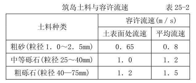 如沉井在浅水(水深小于5m)地段下沉,可填筑人工岛制作沉井,岛面应高出施工期的最高水位0.5m以上,四周留出护道,其宽度:当有围堰时,不得小于1.5m;无围堰时,不得小于2.0m,如图25-8所示。筑岛材料应采用低压缩性的中砂、粗砂、砾石,不得用粘性土、细砂、淤泥、泥炭等,也不宜采用大块砾石。当水流速度超过表25-2所列数值时,须在边坡用草袋堆筑或用其它方法防护。当水深在1.5m、流速在0.5m/s以内时,亦可直接用土填筑,而不用设围堰。