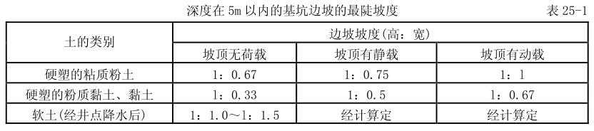 当不设边坡支护的基坑开挖深度在5m以内且坑底在降低后的地下水位以上时,基坑最大允许边坡如表25-1所示。