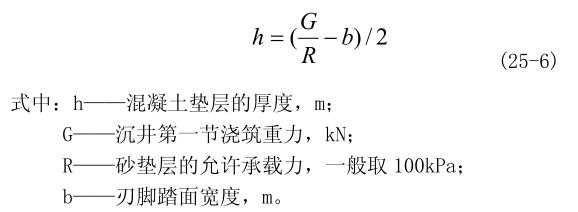 为了确保沉井下素混凝土的质量,尽量减少混凝土在浇灌过程中所产生的沉降量,混凝土垫层厚度可按下式计算: