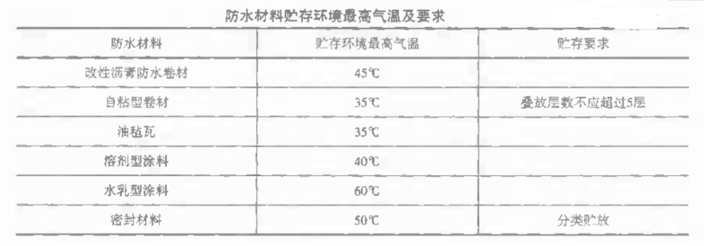 (1)防水材料贮运应避免日晒,并远离火源,仓库内应有消防设施,贮存环境最高温度限制见下表。