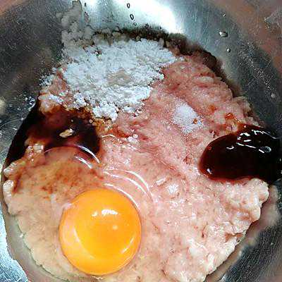 1、瘦肉用绞肉机打成肉沫,加入生抽,蚝油,鸡蛋,生粉,盐,葱花搅匀备用。