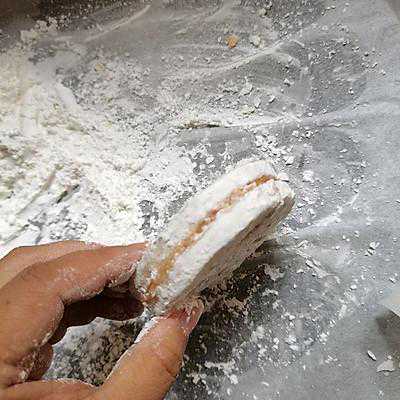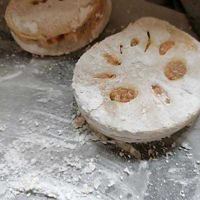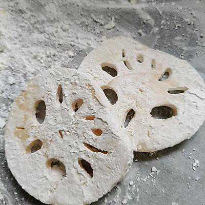 6、粘好生粉的藕夹放一旁,待干生粉吸收,油炸时不会有过多的油,这种方法比裹面糊炸耗的油少,不油腻。
