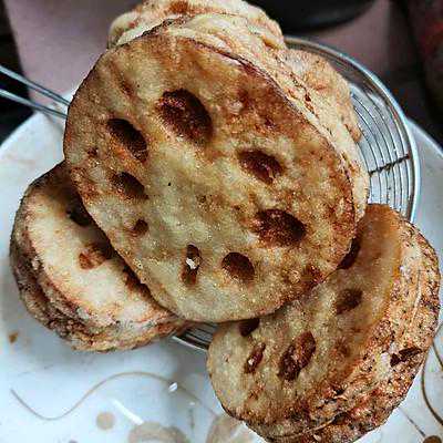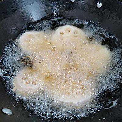 7、锅洗净烧干,下油,待油温七成热(用筷子下锅冒气泡即可),下藕夹,适当翻面油炸。