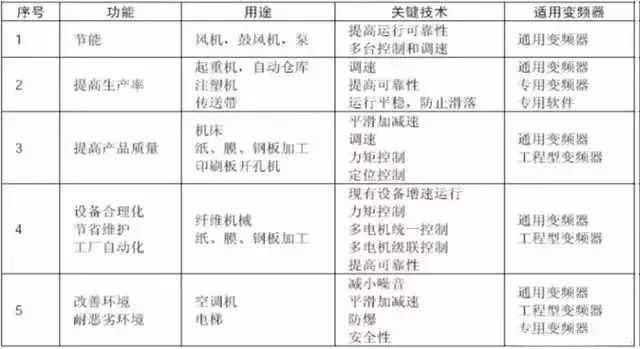 变频器和交流电机构成的可调速传动称为变频器传动,其功能用途如下。其中可能互为关连,实际上无明确分类,此表仅作参考。