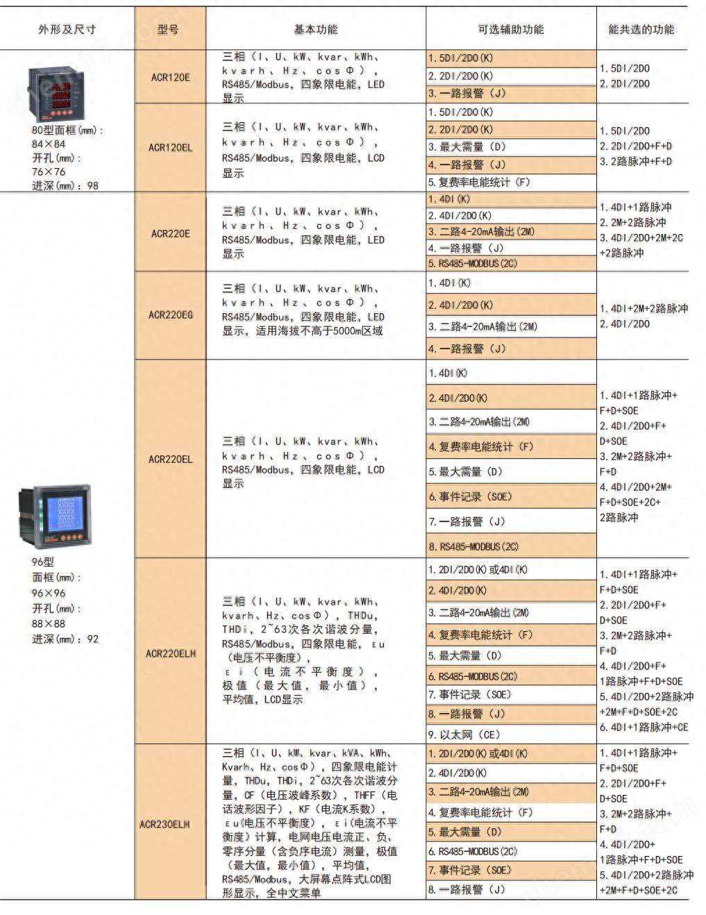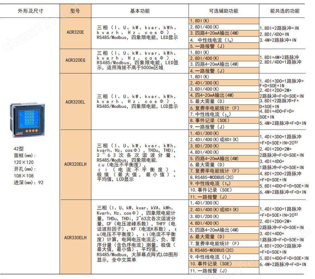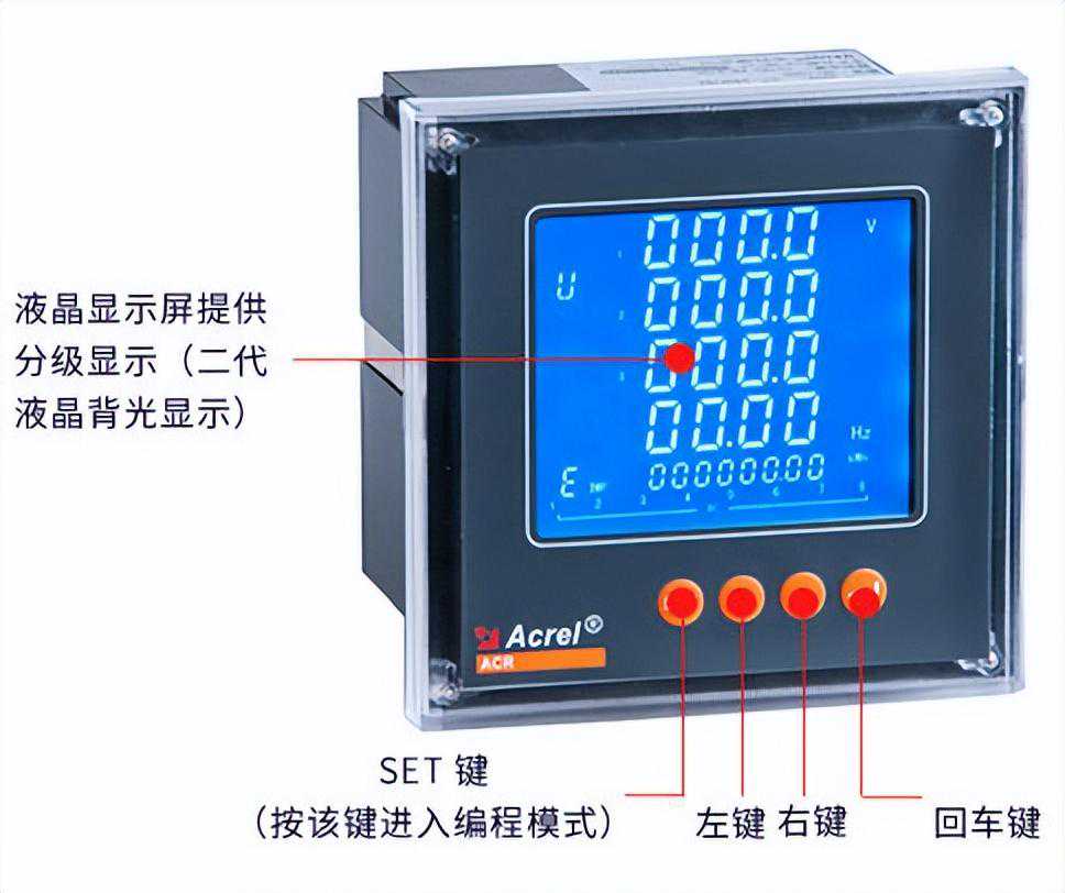 ACR系列电力仪表是针对电力系统、工矿企业、公用设施、智能大厦的电力监控需求而设计的智能表,它集成电力参数的测量(如单相或者三相的电流、电压、有功功率、无功功率、视在功率、频率、功率因数)以及电能监测和考核管理。同时它具有多种外围接口功能可供用户选择:带有RS485通讯接口,采用MODBUS-RTU协议可满足通讯联网管理的需要;4-20mA的模拟量输出可与任意测量的电参量相对应,满足DCS等接口要求;带开关量输入和继电器输出可实现断路器开关的“遥信"和“遥控"的功能,采用高亮度LED/LCD显示界面,通过面板按键来实现参数设置和控制,非常适合于实时电力监控系统。可以直接取代常规电力变送器及测量仪表。作为一种先进的智能化、数字化的前端采集元件,该电力仪表已广泛应用于各种控制系统,SCADA系统和能源管理系统中。李艳秋18-70+170/69-/15