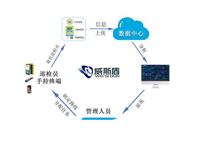 工作原理:巡检人员通过智能巡检仪按照制定的巡检路线,定人、定点、定时、定内容、定标准进行巡检,到达指定巡检点后读取巡检点信息,这些数据通过数据传输或实时传输到数据中心,数据中心以表或图形形式展现给管理人员的一个过程。