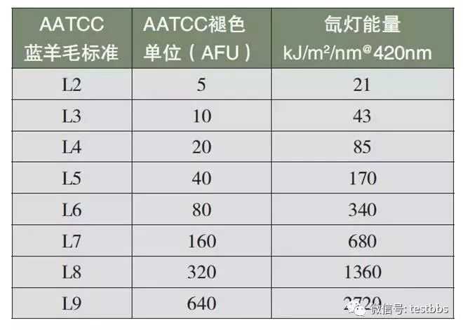 在GB/T8427和ISO105B02中,对兰色羊毛标样1-8与L2-L9有详细描述,他们成分都是羊毛,都有8个级别的蓝标,且每一较高编号兰标的耐光色牢度比前一编号约高1倍。但它们使用的染料和制作工艺不同。