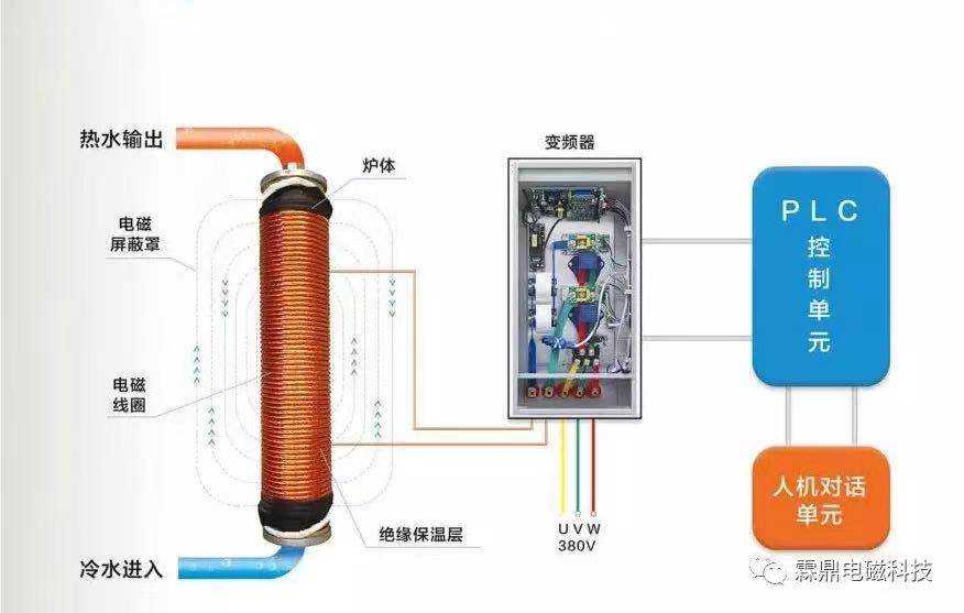 电磁锅炉主要是由电磁加热器(即变频器)和电磁加热炉体组成,高频交变电流作用在线圈产生交变磁场,通过电磁感应使炉体产生涡流,无数涡流对炉体进行加热,从而使路体内的水达到加热目的。由于工作频率超出人体正常音频,故工作时不会有噪声。