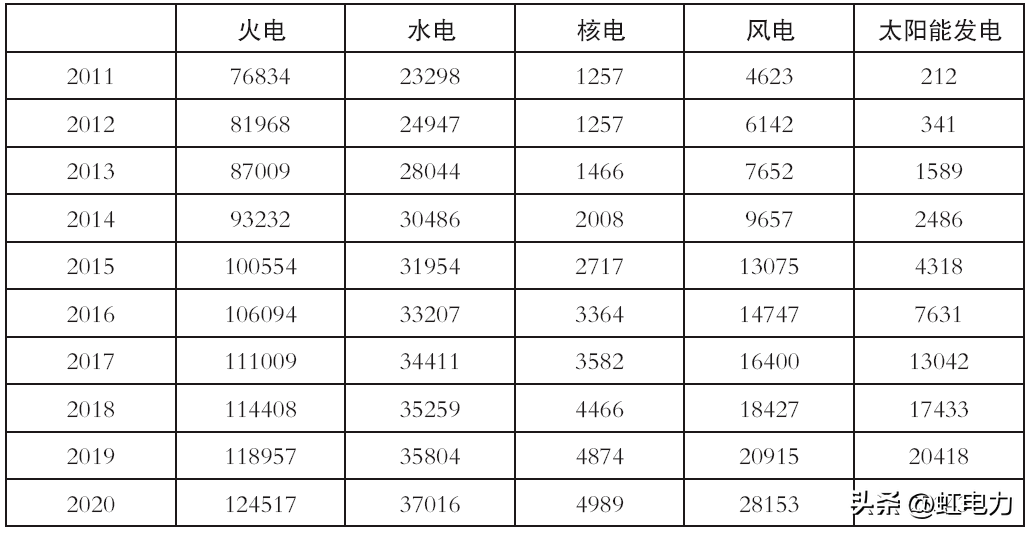 2011~2020年全国电力装机结构(单位:万千瓦)