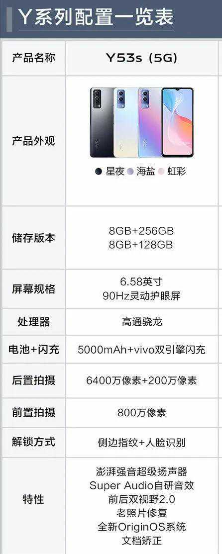 vivoY53s采用了一块6.58英寸FHD+屏幕,分辨率为2408*1080,支持90Hz刷新率。此外这块屏幕还支持98%的DCI-P3广色域,屏幕色彩表现更为丰富。