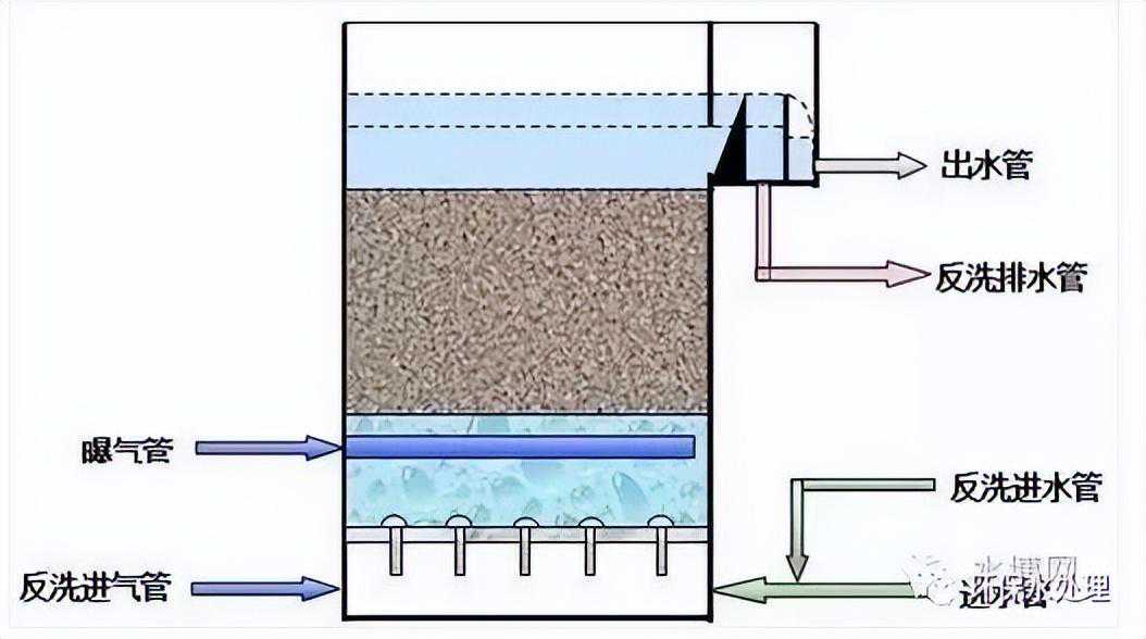随着过滤的进行,由于滤料表面新产生的生物量越来越多,截留的SS不断增加,在开始阶段滤池水头损失增加缓慢,当固体物质积累达到一定程度,使水头损失达到极限水头损失或导致SS发生穿透,此时就必须对滤池进行反冲洗,以除去滤床内过量的微生物膜及SS,恢复其处理能力。