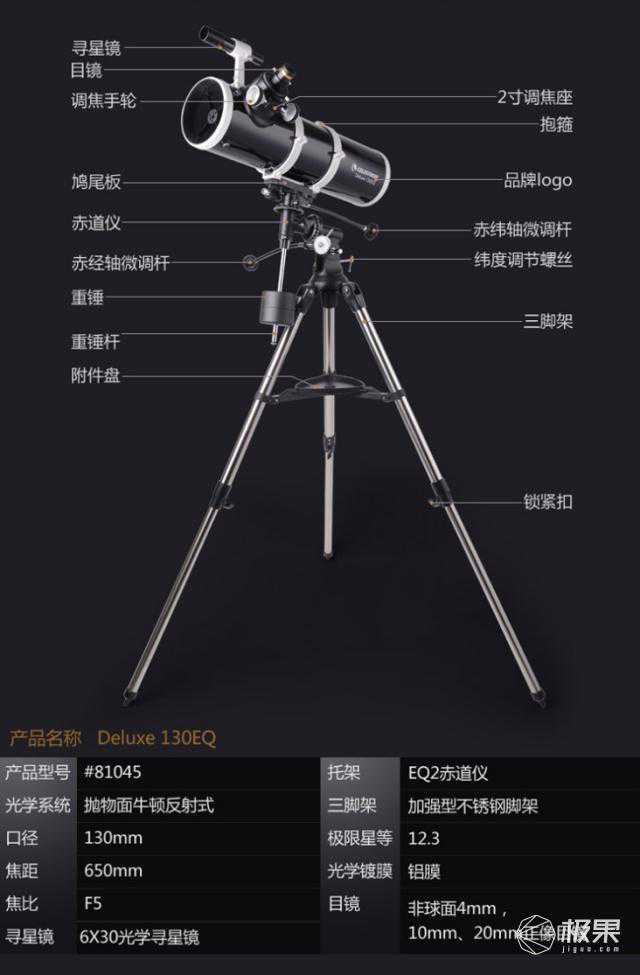 Delux130EQ的镜筒是130mm口径的,650mm的焦距。你可能会搞不明白这些数字是什么概念,其实可以用摄影的知识来理解。看不看得见,取决于焦距,看不看得清,取决于口径。想要目视木星大红斑和土星的卡西尼缝,焦距足够都是可以的。但是口径会类似相机的CCD,全画幅跟残幅的关系,更大的口径可以获得更清晰的影像。更大的口径可接受的能量越大,观测弱目标的能力也越强。