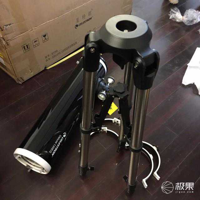 不锈钢的三脚架是天文望远镜的首选,这个和摄影的时候一个道理,在微调的时候可以保证稳定。高度调节通过脚架上方的手拧螺丝。脚架顶端用于安装赤道仪,脚架下方有一个附件盘用于放目镜等小配件,非常方便。
