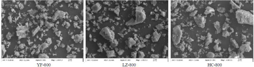 上图放大倍数为2000倍。从图中可以看出,三种碳酸钙粒子均呈无规形状,其中采用大方解生产的YF-800颗粒表面孔和凹陷较多点,结晶度更完整,颗粒表面没有附着太多小颗粒;而其他两种矿石加工的粉体其表面都附着了一定的小颗粒,有些成为了一些小的团聚体。从粒子分布的均匀度上看,YF-800的粒子分布的更均匀,颗粒的大小基本一致,而其他两种碳酸钙颗粒大小差异程度比较大,粒子分布相对不均匀一些。