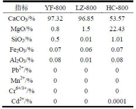 从表中结果可以看出,江西永丰大方解加工的YF-800碳酸钙含量最高,杂质元素和重金属含量最低;连州小方解加工的LZ-800的SiO2最低,相对而言对加工设备的磨损也会低;海城白云石加工的HC-800,其成分为典型的白云石成分,其中MgO的含量较多,达到22.43%,碳酸钙的纯度较低,因此粉体一些性能可能会受到影响。