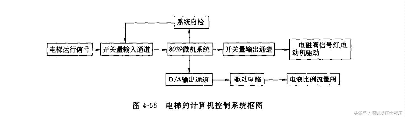 电梯运行采用微机控制,系统以“MCS-48”系列单片机为核心,配以输人、输出过程通道,完成电梯信号控制、速度控制和平层控制。计算机控制系统框图如图4-56所示。