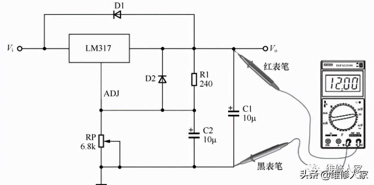 将可调电阻RP左旋到头,使ADJ端子电压为0,用数字万用表或指针万用表的电压挡测量,滤波电容C1两端电压应低于1.25V,随后慢慢向右旋转RP,使C2两端电压逐渐升高,C1两端电压也应逐渐升高,最高电压接近37V。否则,说明LM317异常。