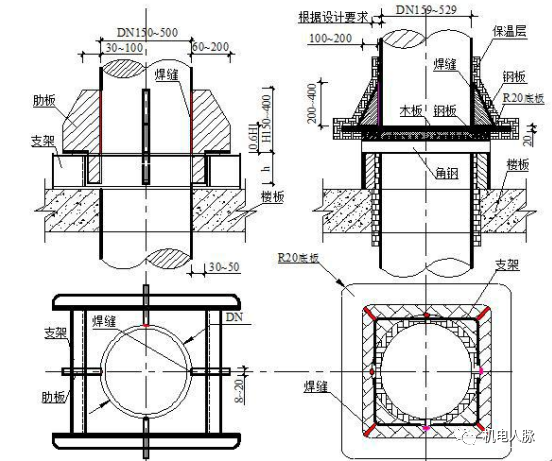 17)采用膨胀螺栓加钢板作为受力点时,选择膨胀螺栓规格、型号、抗拉、抗剪强度应满足管道、设备负荷要求,膨胀螺栓个数经计算选择。螺栓距钢板边沿尺寸应为25~30mm,受力根部应加垫片。