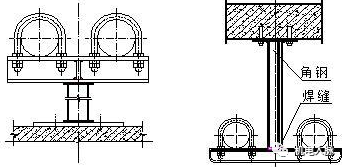 (7)空调水管道木托支架,木托与支架横担、扁钢卡环同宽,卡环与螺杆应满焊连接;在与支架连接处应垂直,扁钢端部与支架宜留有5~8mm收缩余量,卡环端部外露支架的螺栓宜采用圆头螺帽收头,油漆涂刷应均匀。