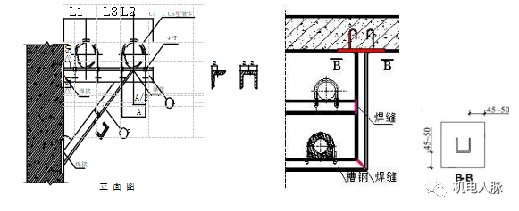 2)支吊架加工制作应机械切割钻孔,孔径为螺栓直径+2mm;支架端部打磨光滑、倒圆弧角,倒角半径为型钢端面边长的1/3~1/2,支架拐角处应采用45°拼接焊接,焊缝应饱满、打磨平滑。