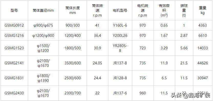 湿法溢流球磨机多处理较细物料磨矿,一般磨矿粒度小于0.2mm,常用在精矿再磨作业中,其处理能力范围在0.25~200t/h,每各型号的处理范围不同,以下展示部分湿法溢流球磨机参数表(详细参数查阅:直筒节能溢流型球磨机):