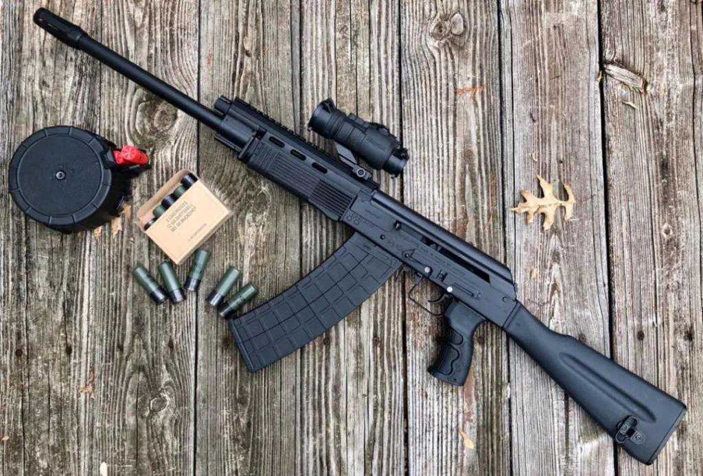 Saiga-12半自动霰弹枪。罗斯伊茨玛希工厂于1990年代以卡拉什尼科夫的AK系列研制及生产半自动战斗霰弹枪,设计时还预备了可以转换成不同口径的型号的空间,例如其口径设为12号口径霰弹、20号口径霰弹和·410bore。