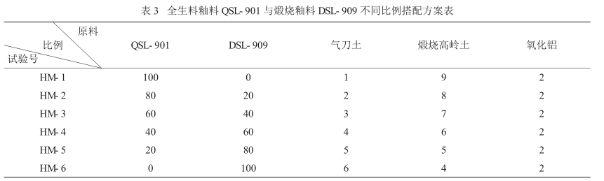 为了系统地试验煅烧釉料对抛釉砖耐污性能的影响,根据釉料配方温度接近原则,将制备的煅烧釉(DSL-909)料与目前公司防污性能最好的大生产全生料透明釉(QSL-901)按不同比例搭配得到不同透明釉浆料,以研究不同掺入量的煅烧釉料对抛釉砖防污性能的影响(如表3)。